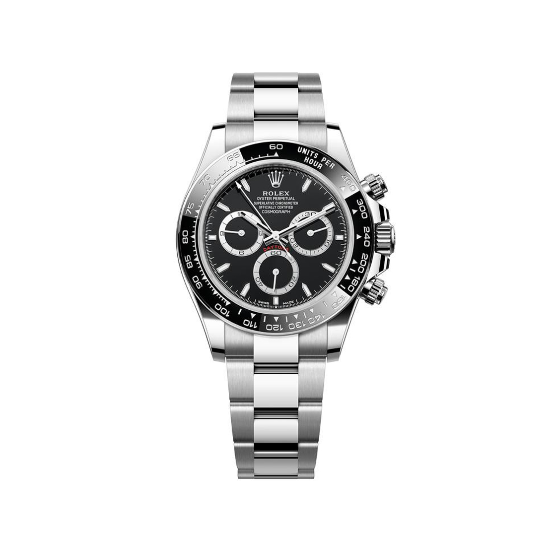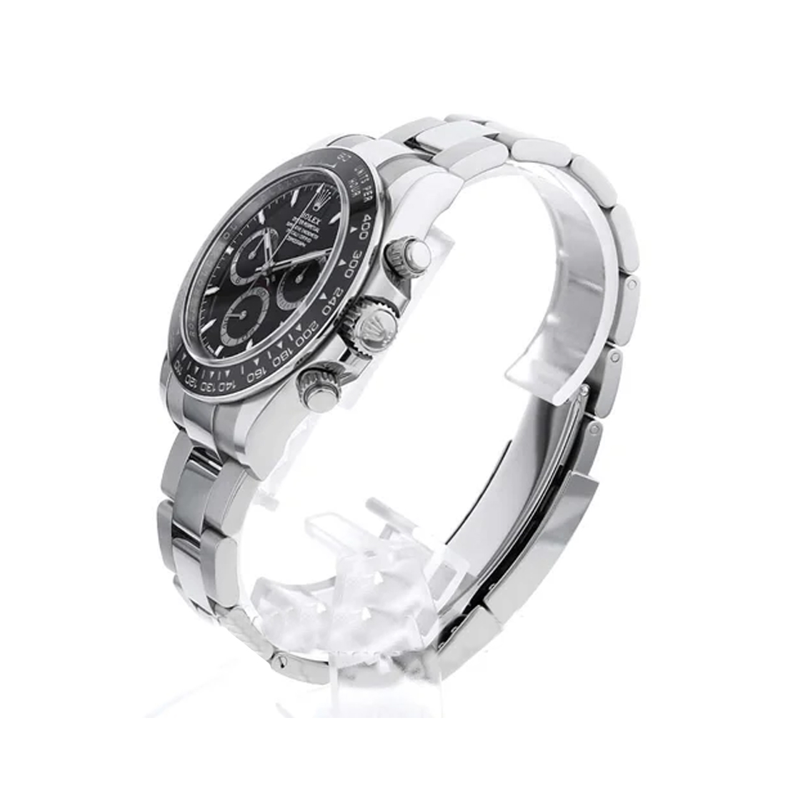 Rolex Daytona reference 126500LN, complete set. The Rolex Daytona reference 126500LN features a 40mm stainless steel case, a stainless steel Oyster bracelet, and a black ceramic bezel. Powered by the Rolex in-house Calibre 4131 movement, it includes a chronograph function, allowing you to time your activities with precision and ease.