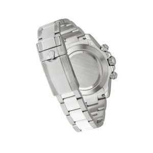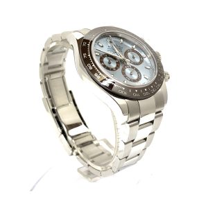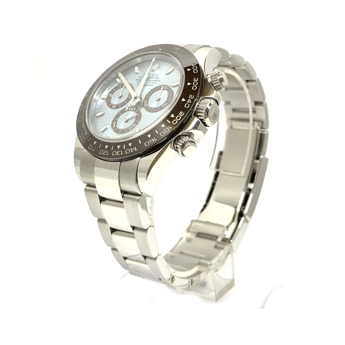 Preowned-116506 Rolex The Rolex Oyster Perpetual Cosmograph Daytona 116506 is a luxury watch with a 40mm 950 platinum case, giving it a solid and sturdy feel. The chestnut brown monobloc Cerachrom bezel with an engraved tachymetric scale deposited with platinum via PVD adds to the watch’s elegant look. The screw-down crown and push buttons, along with the ice blue dial with chestnut brown lacquer counters, create a sophisticated and modern design. The Chromalight appliqués on the hands and index hour markers with Chromalight appliques ensure that the watch can be easily read in low-light conditions. The watch is powered by a self-winding perpetual mechanical chronograph movement, ensuring accurate timekeeping and a smooth operation. The watch performs following functions: hours, minutes, seconds, tachemeter, chronograph. Self-winding mechanical movement is powered by a Сalibre 4130. Power reserve approximately 72 hours. Case Thickness – 11.9 mm. Case back is solid. Sapphire crystal protects front side of the watch.The platinum Oyster bracelet with a folding buckle provides a comfortable and secure fit. With a water resistance of up to 100 m / 330ft, the Rolex Oyster Perpetual Cosmograph Daytona 116506 is suitable for swimming, snorkeling, and other water-related activities. Overall, this watch is an excellent choice for those who want a luxury timepiece that offers both style and functionality.