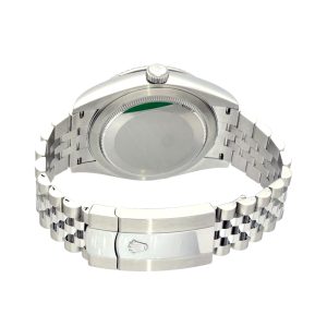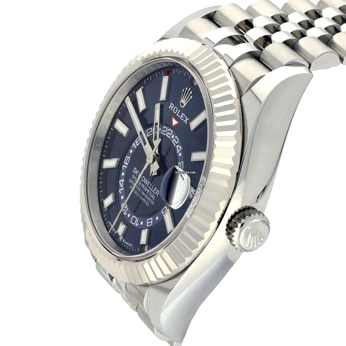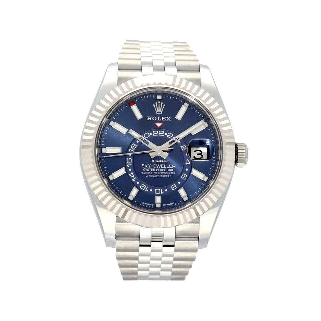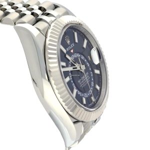 This unworn 2025 model features the highly coveted blue sunray dial, renowned for its rich depth of color and striking clarity. The 42 mm Oystersteel case is paired with a crisp, fluted 18 ct white gold bezel, reinforcing the unmistakable Sky-Dweller identity. The Jubilee bracelet enhances the overall aesthetic with its dress-oriented comfort and refined five-link construction.